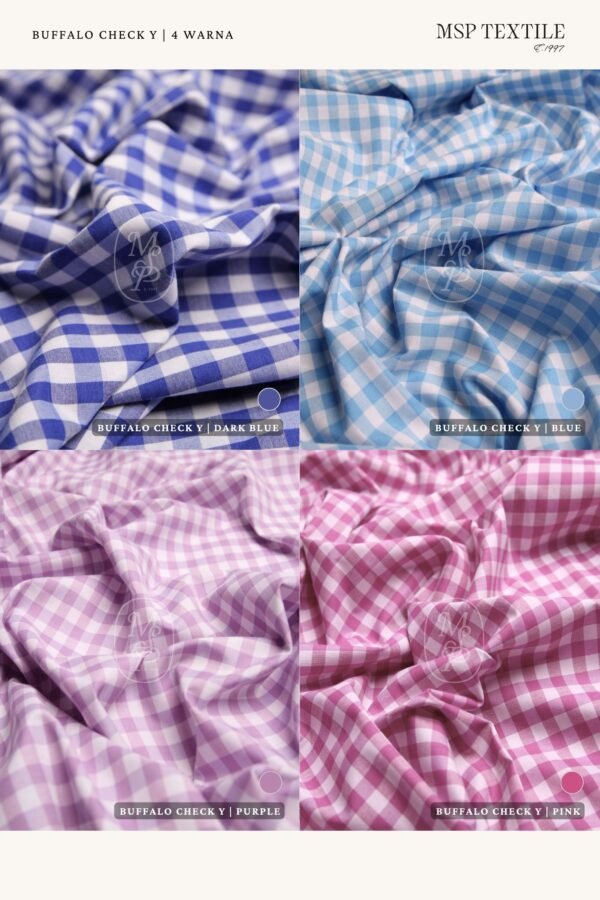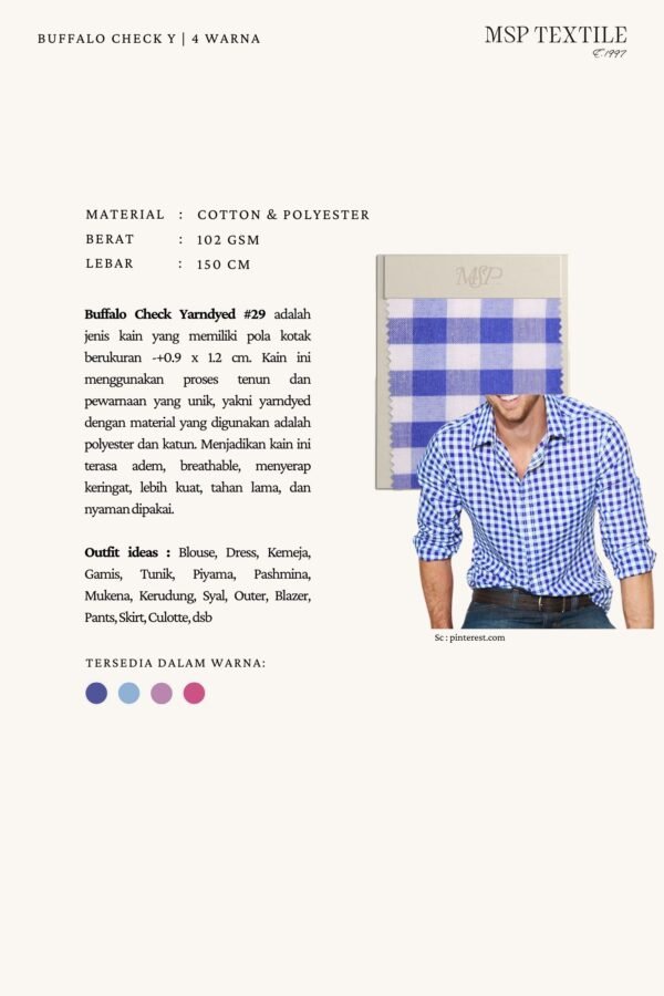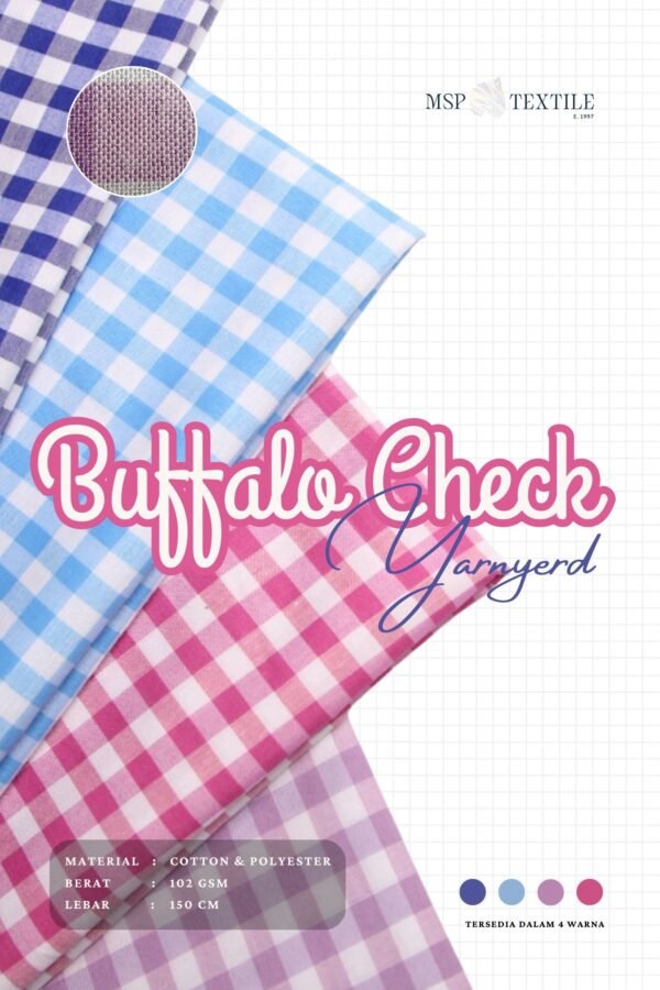 Buffalo Check Yarndyed #29 adalah jenis kain yang memiliki pola kotak berukuran -+0.9 x 1.2 cm. Kain ini menggunakan proses tenun dan pewarnaan yang unik, yakni yarndyed dengan material yang digunakan adalah polyester dan katun. Menjadikan kain ini terasa adem, breathable, menyerap keringat, lebih kuat, tahan lama, dan nyaman dipakai.