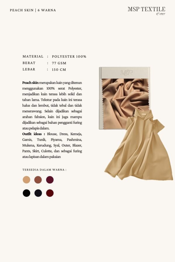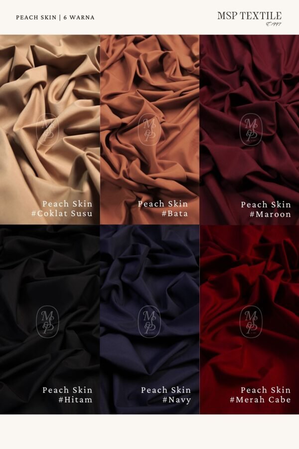 Peach skin merupakan kain yang ditenun menggunakan 100% serat polyester, menjadikan kain terasa lebih padat dan tahan lama. Tekstur pada kain ini terasa halus dan lembut, tidak tebal dan tidak menerawang. Selain dijadikan sebagai arah fahsion, kain ini juga dapat dijadikan sebagai bahan pengganti furing atau pelapis dalam.