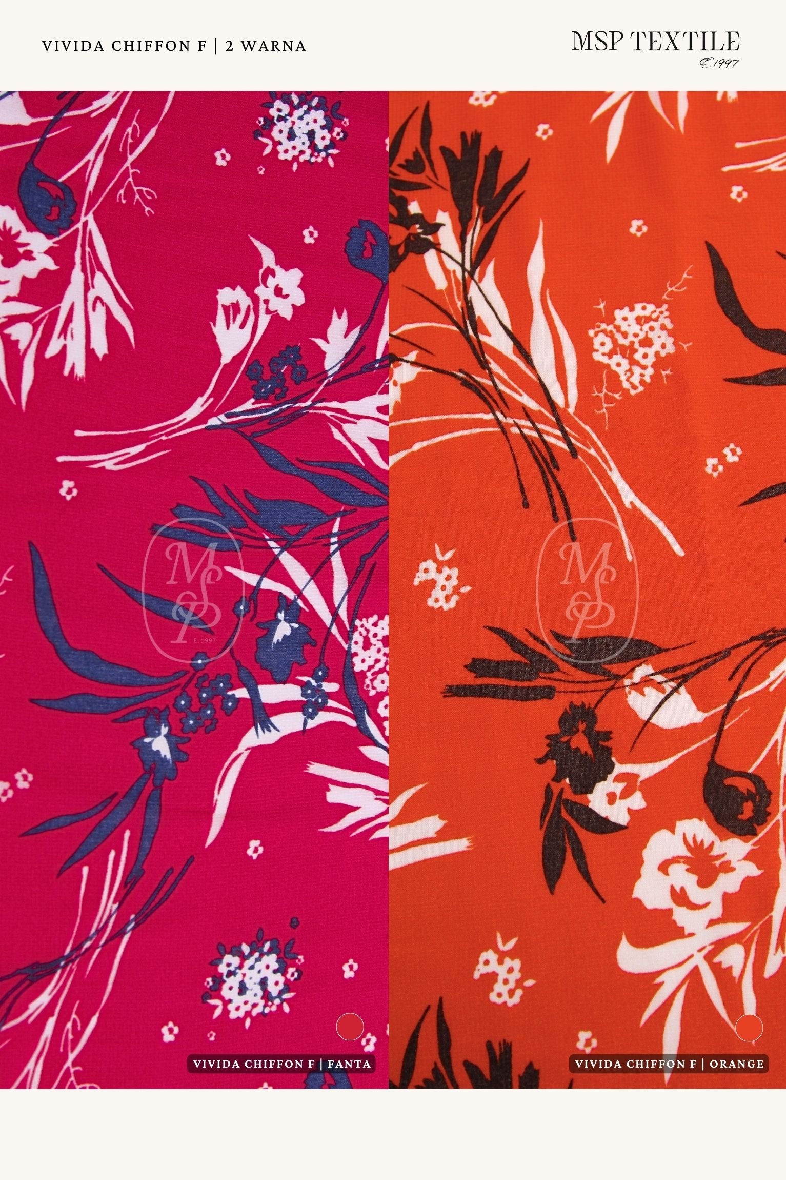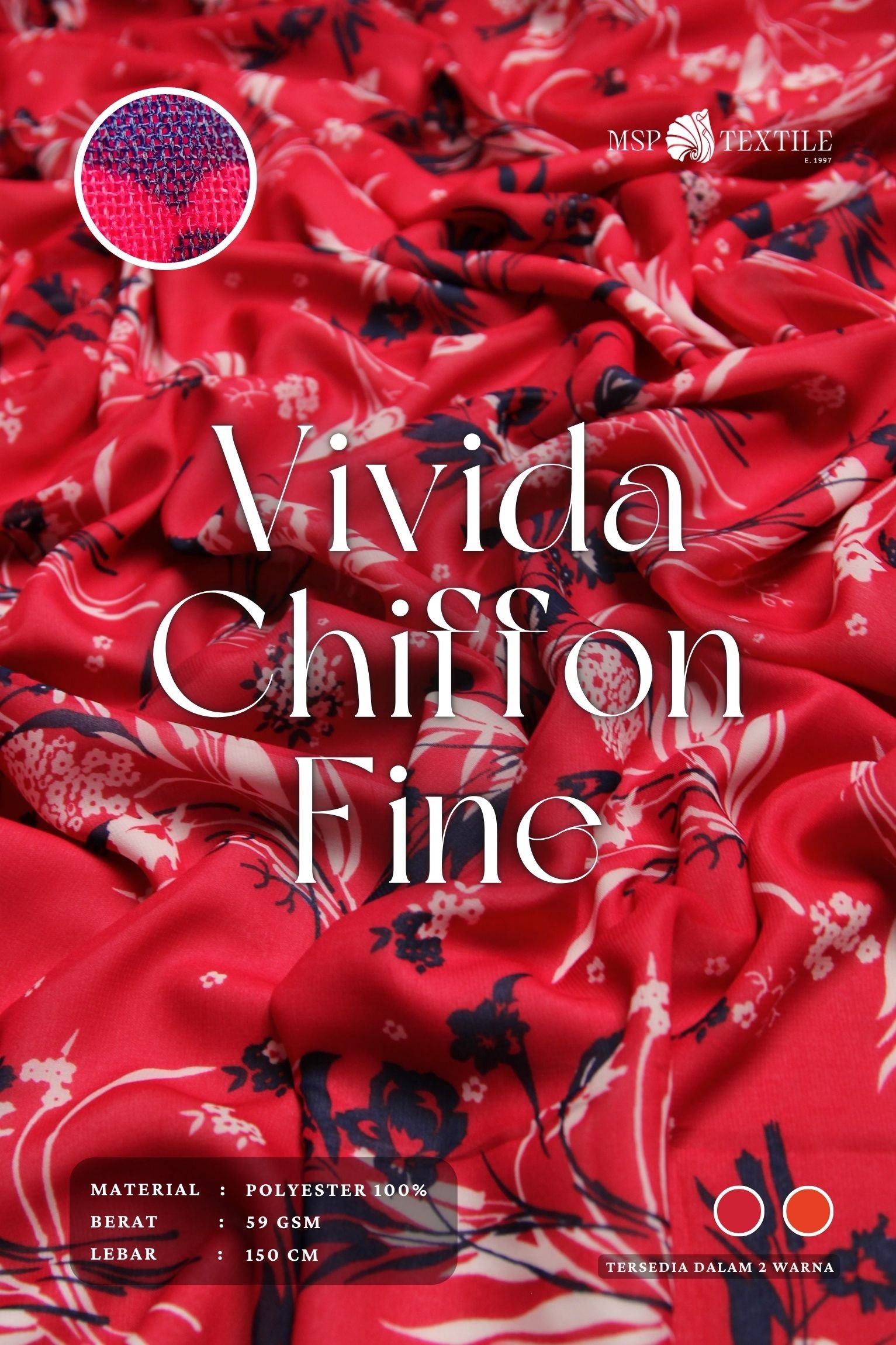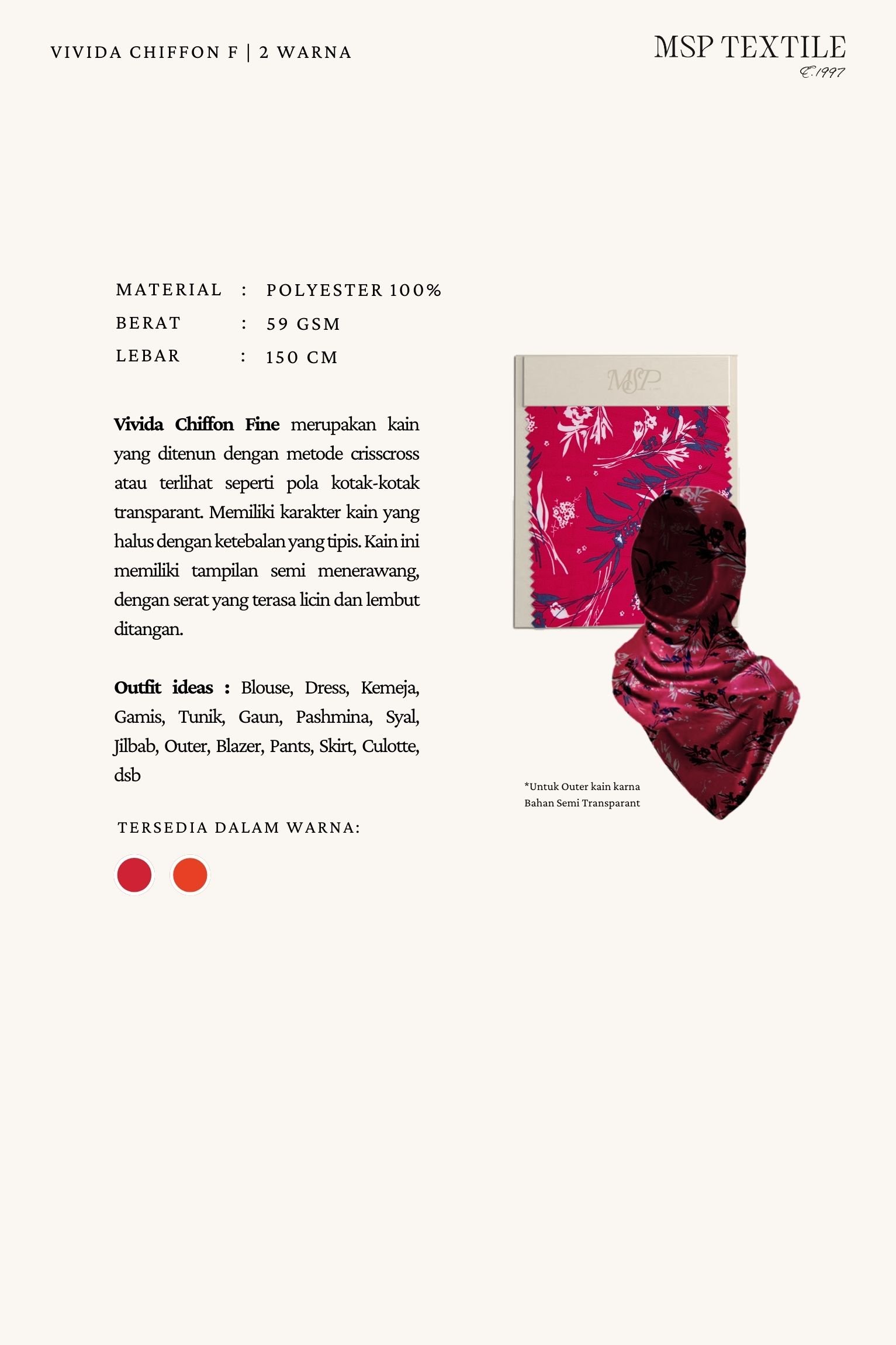 Vivida Chiffon Fine merupakan kain yang ditenun dengan metode crisscross atau terlihat seperti pola kotak-kotak transparant. Memiliki karakter kain yang halus dengan ketebalan yang tipis. Kain ini memiliki tampilan semi menerawang, dengan serat yang terasa licin dan lembut ditangan.
