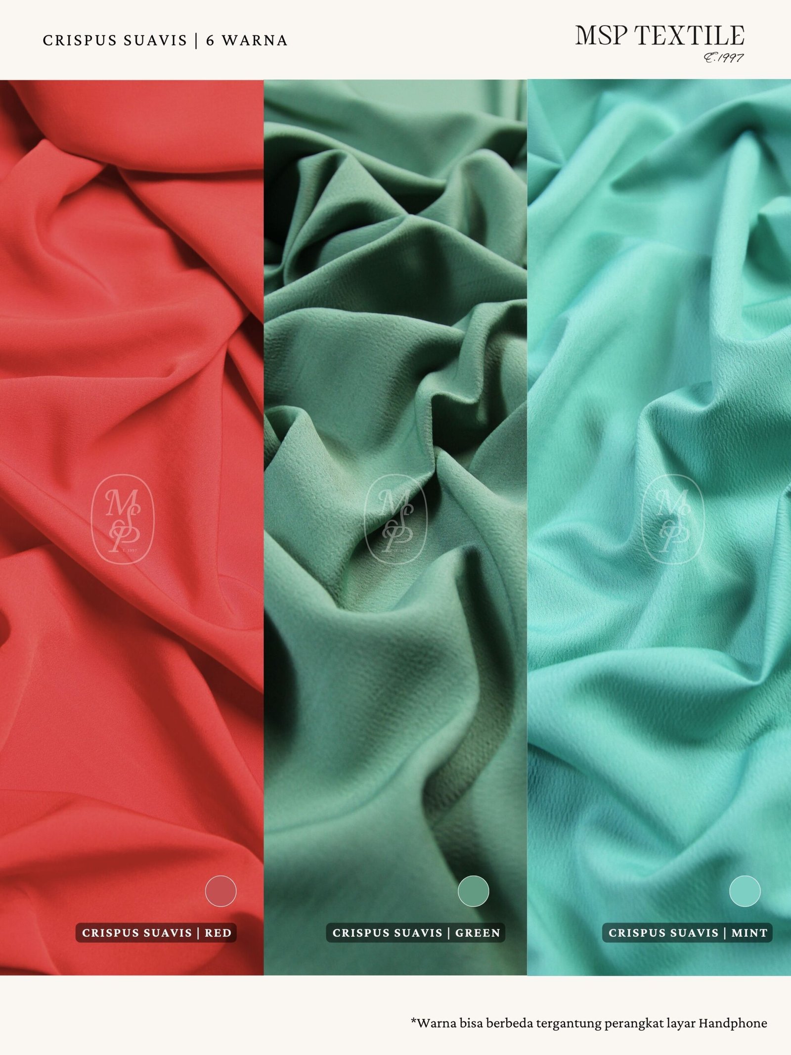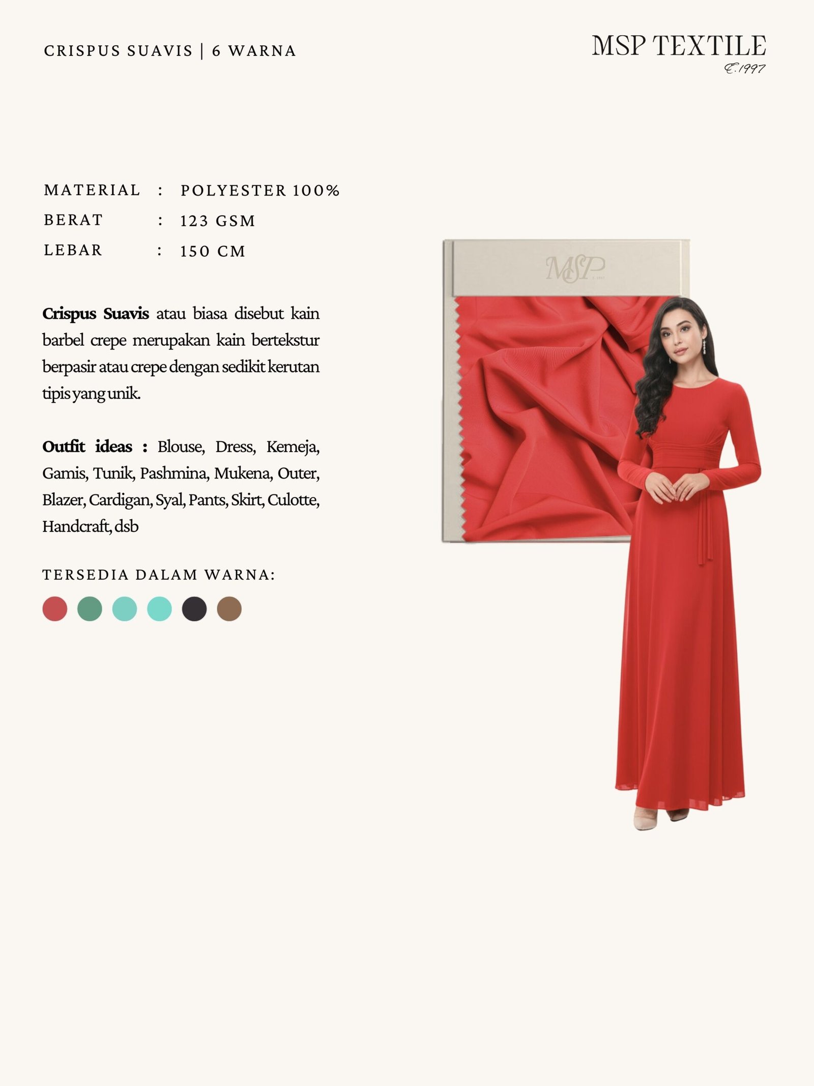 Crispus Suavis atau biasa disebut kain barbel crepe merupakan kain bertekstur berpasir atau crepe dengan sedikit kerutan tipis yang unik.