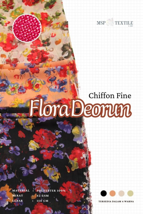 Flora Deorun Chiffon merupakan kain yang ditenun dengan metode crisscross atau terlihat seperti pola kotak-kotak transparant. Memiliki karakter kain yang halus dengan ketebalan yang tipis. Kain ini memiliki tampilan semi menerawang, dengan serat yang terasa licin dan lembut ditangan