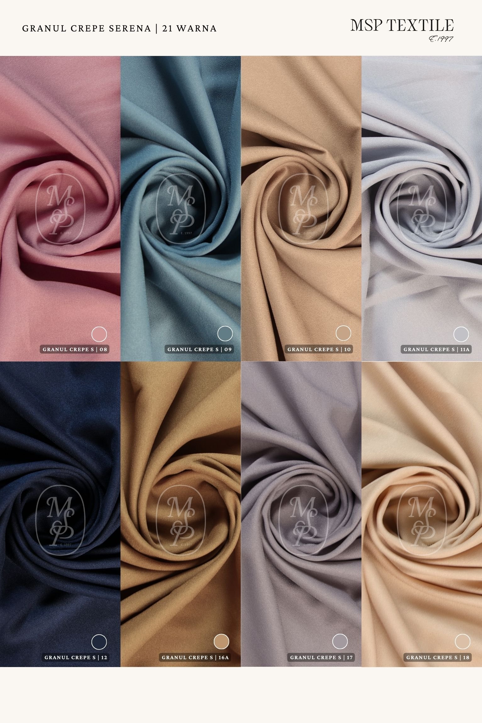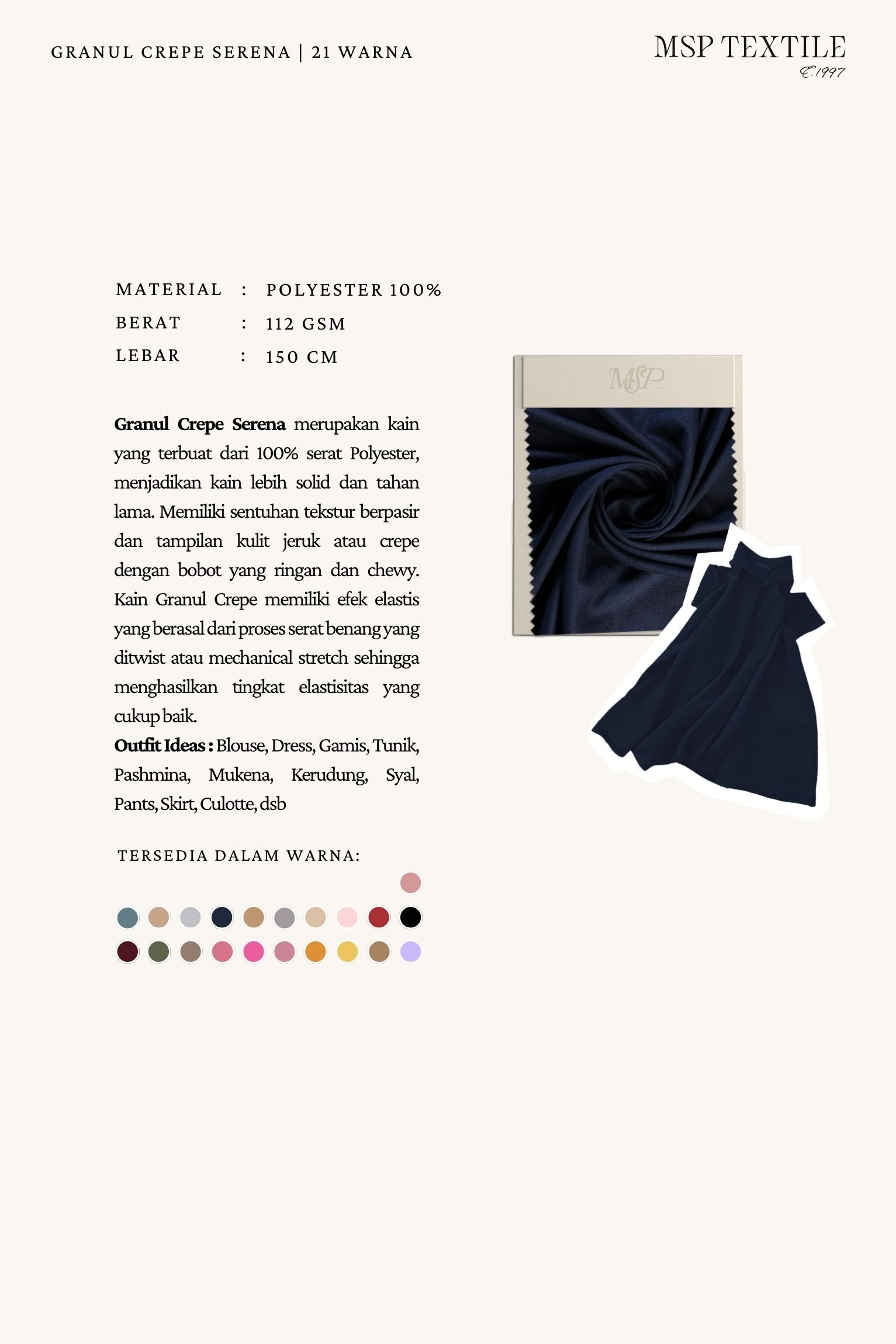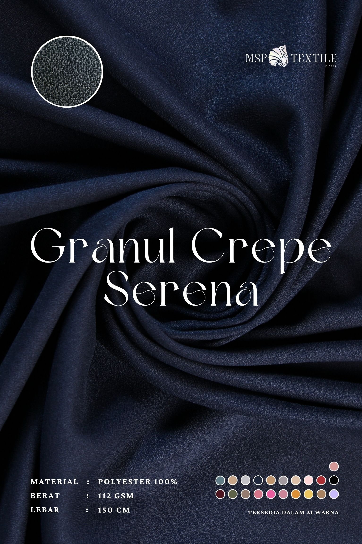 Granul Crepe (Mosscrepe Stretch) merupakan kain yang terbuat dari 100% serat Polyester, menjadikan kain lebih solid dan tahan lama. Memiliki sentuhan tekstur berpasir dan tampilan kulit jeruk atau crepe dengan bobot yang ringan dan chewy. Kain Granul Crepe memiliki efek elastis yang berasal dari proses serat benang yang ditwist atau mechanical stretch sehingga menghasilkan tingkat elastisitas yang cukup baik.