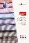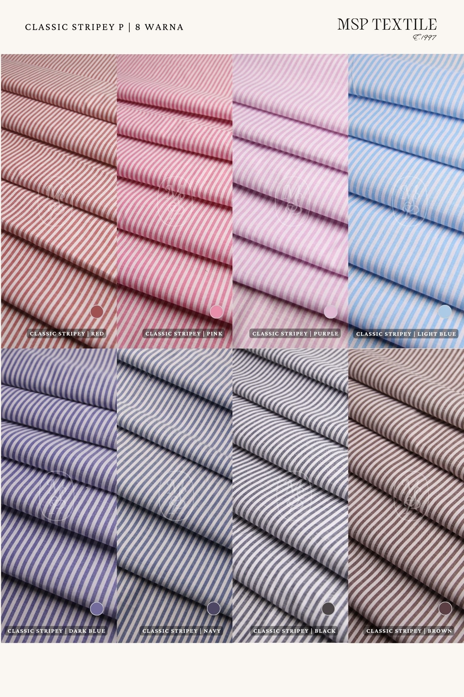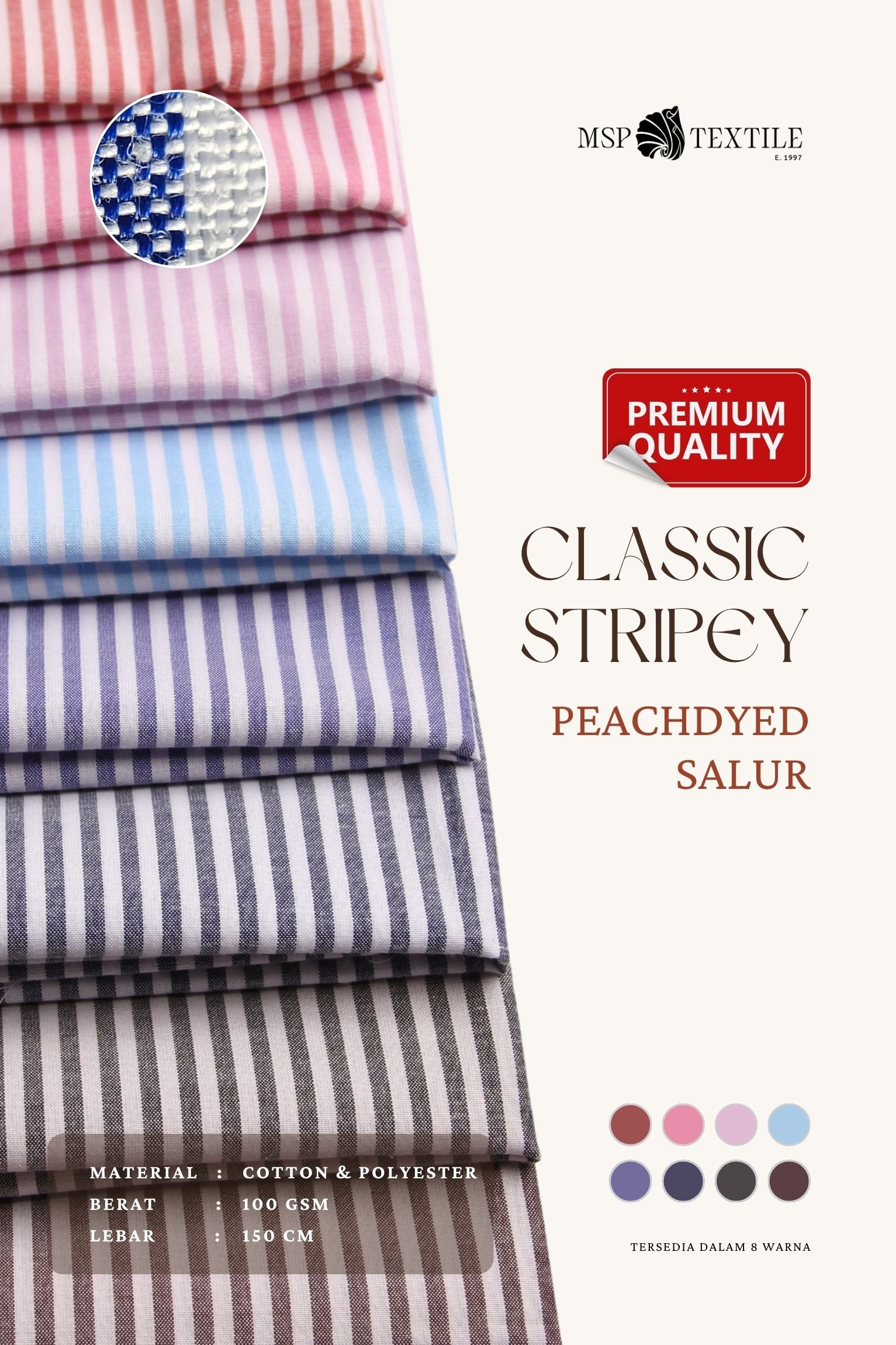 CLASSIC STRIPEY PEACHDYED SALUR menggunakan material percampuran antara polyester dan katun. Kain ini menggunakan metode peace dyed, dimana proses pencelupan dilakukan setelah benang ditenun menjadi kain mentah atau greige.