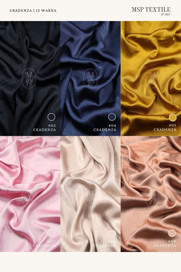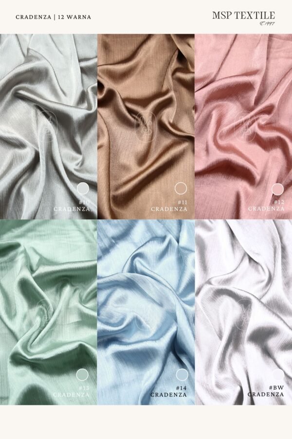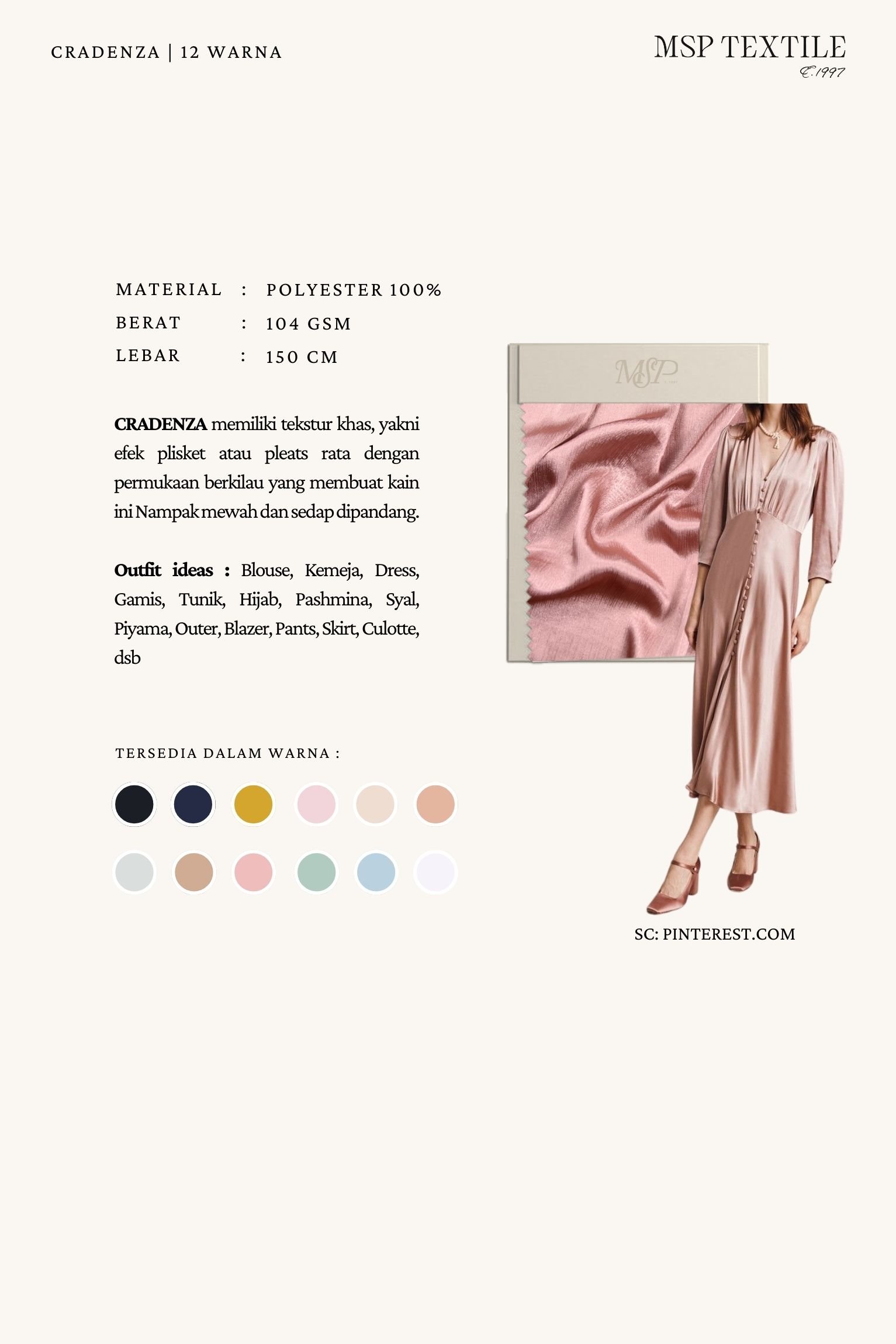 CRADENZA PREMIUM memiliki tekstur khas, yakni efek plisket atau pleats rata dengan permukaan berkilau yang membuat kain ini Nampak mewah dan sedap dipandang.