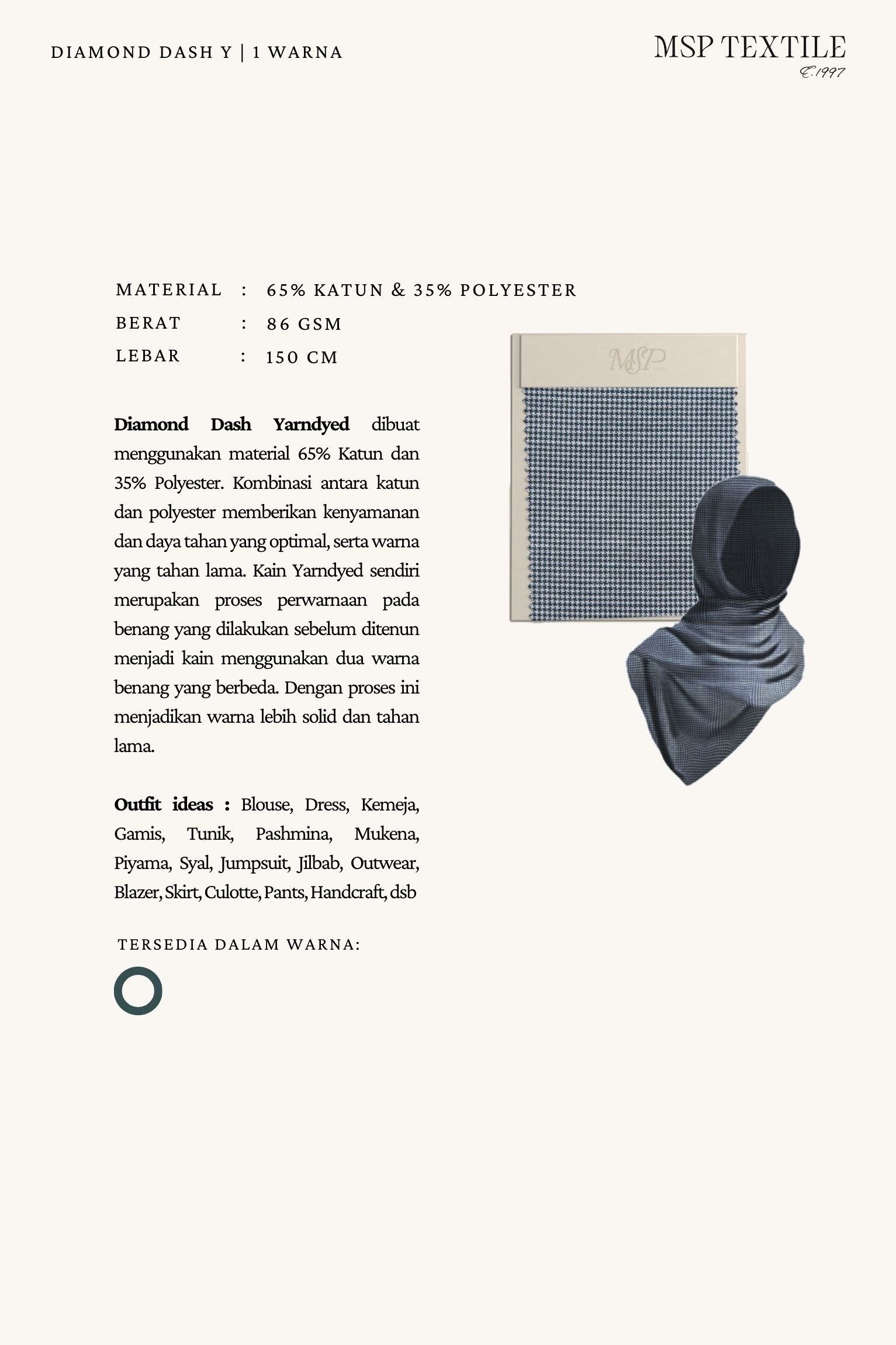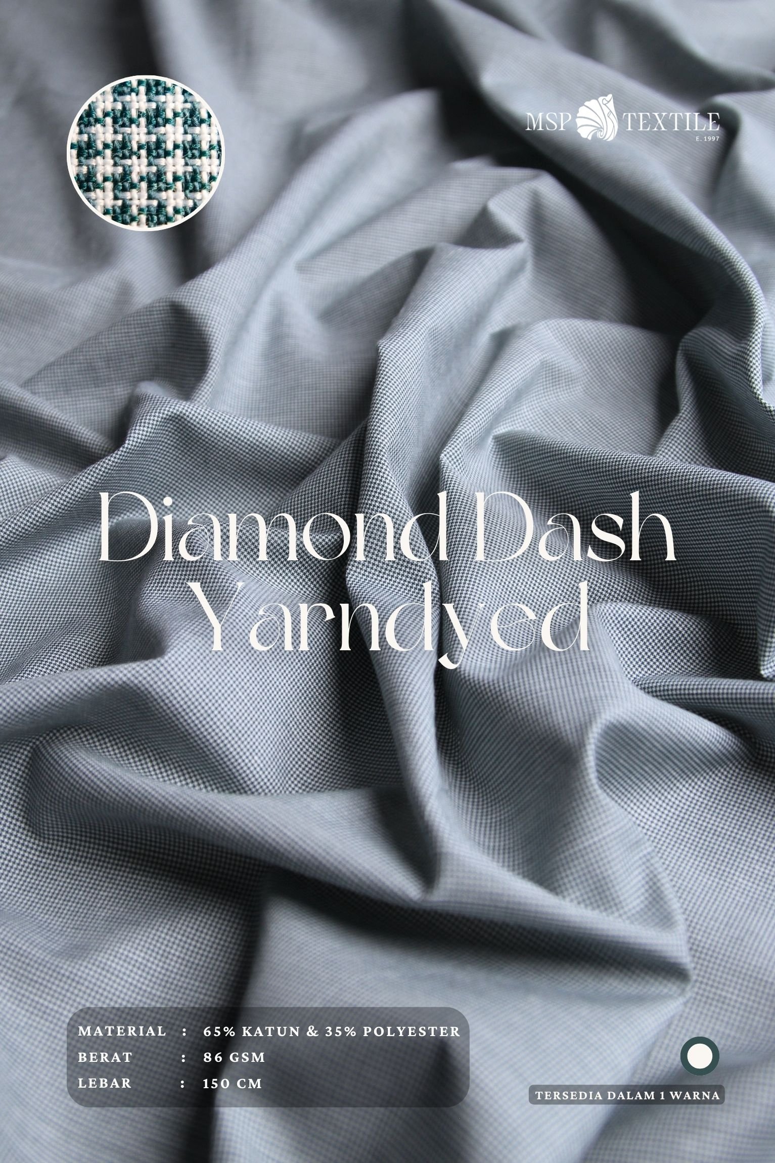 DIAMOND DASH YARNDYED dibuat menggunakan material 65% Katun dan 35% Polyester. Kombinasi antara katun dan polyester memberikan kenyamanan dan daya tahan yang optimal, serta warna yang tahan lama. Kain Yarndyed sendiri merupakan proses perwarnaan pada benang yang dilakukan sebelum ditenun menjadi kain menggunakan dua warna benang yang berbeda. Dengan proses ini menjadikan warna lebih solid dan tahan lama.