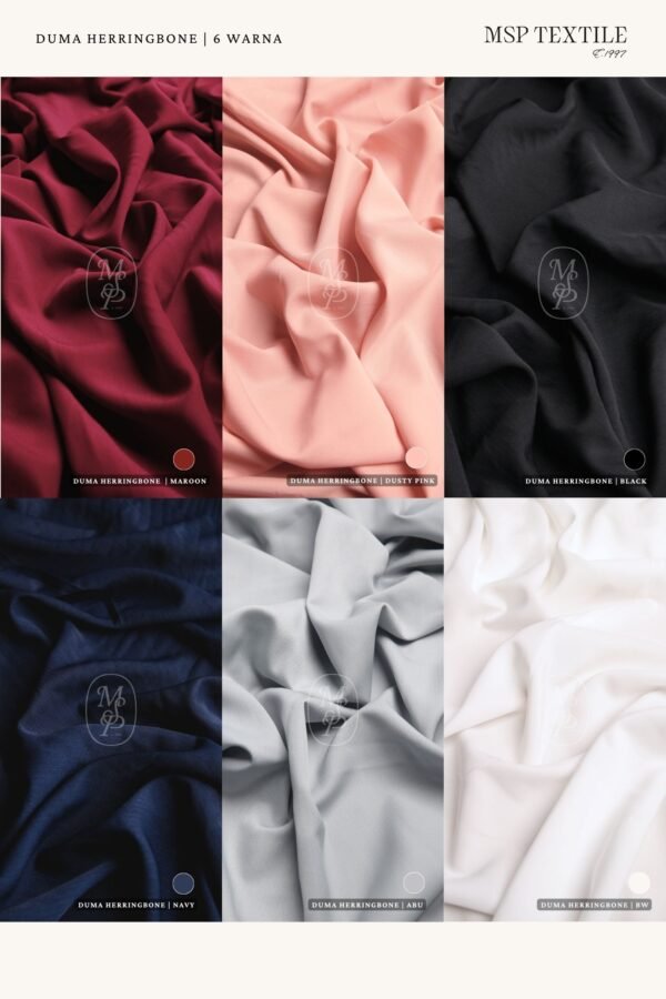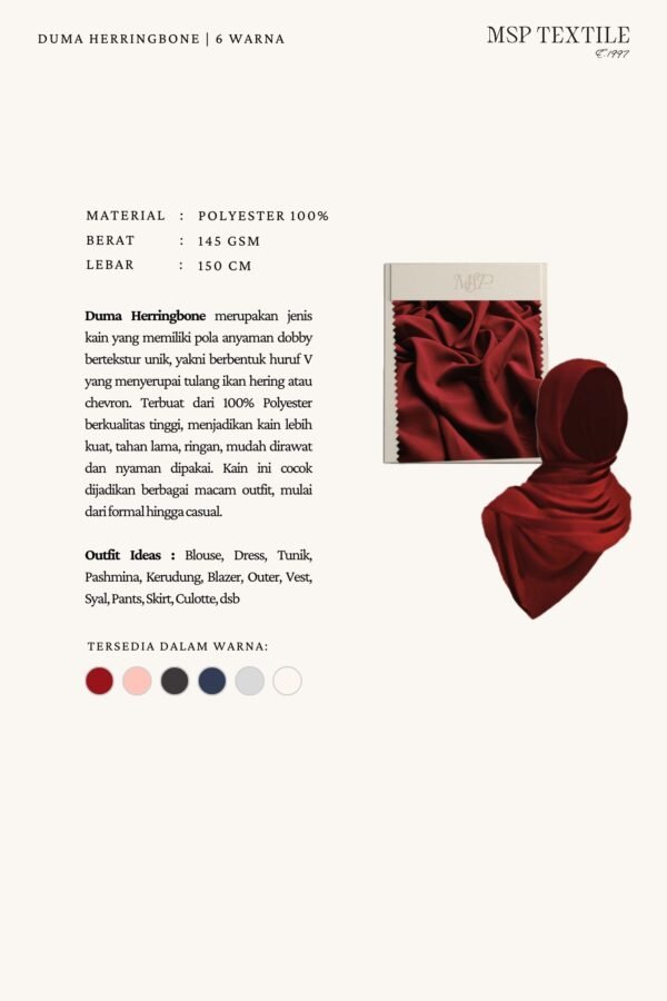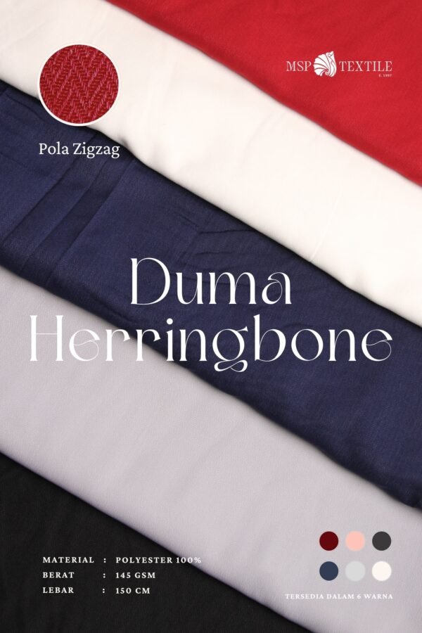 DUMA HERRINGBONE merupakan jenis kain yang memiliki pola anyaman dobby bertekstur unik, yakni berbentuk huruf V yang menyerupai tulang ikan hering atau chevron. Terbuat dari 100% Polyester berkualitas tinggi, menjadikan kain lebih kuat, tahan lama, ringan, mudah dirawat dan nyaman dipakai. Kain ini cocok dijadikan berbagai macam outfit, mulai dari formal hingga casual.