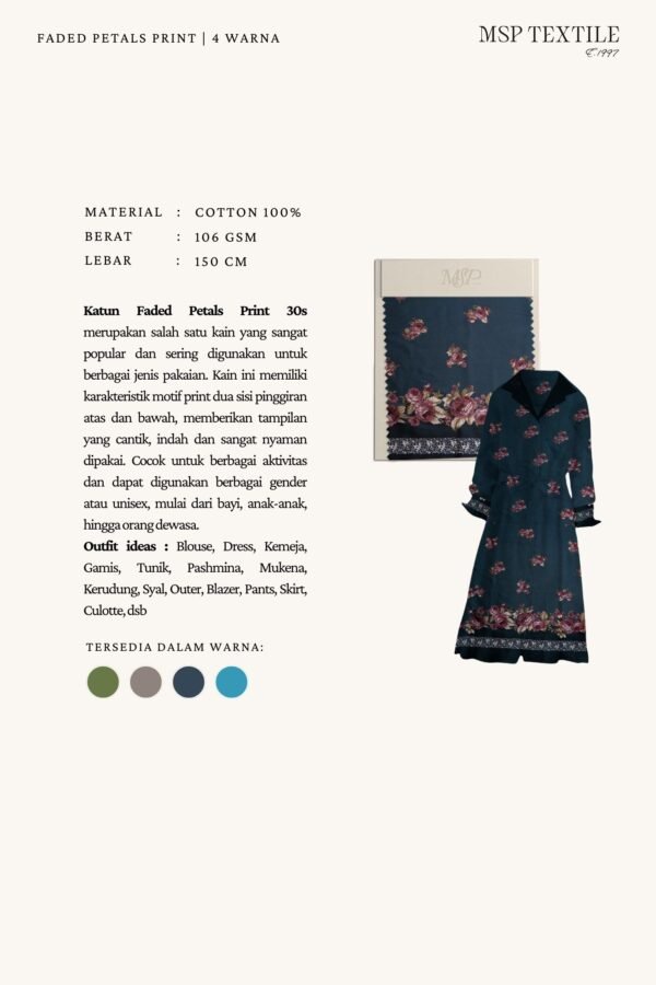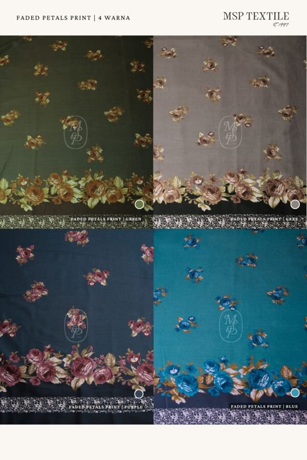 Katun Faded Petals Print 30s merupakan salah satu kain yang sangat popular dan sering digunakan untuk berbagai jenis pakaian. Kain ini memiliki karakteristik motif print dua sisi pinggiran atas dan bawah, memberikan tampilan yang cantik, indah dan sangat nyaman dipakai. Cocok untuk berbagai aktivitas dan dapat digunakan berbagai gender atau unisex, mulai dari bayi, anak-anak, hingga orang dewasa.