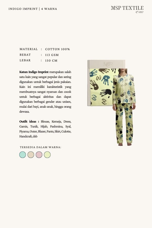 Katun Indigo Imprint merupakan salah satu kain yang sangat popular dan sering digunakan untuk berbagai jenis pakaian. Kain ini memiliki karakteristik yang membuatnya sangat nyaman dan cocok untuk berbagai aktivitas dan dapat digunakan berbagai gender atau unisex, mulai dari bayi, anak-anak, hingga orang dewasa.