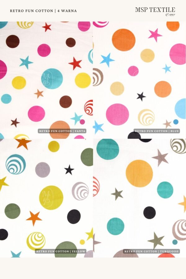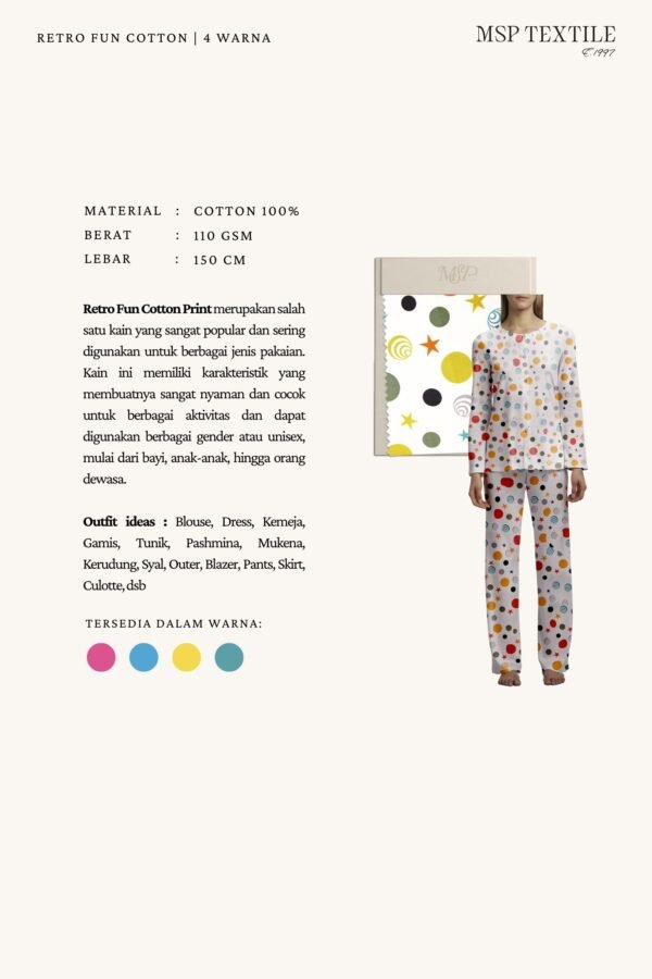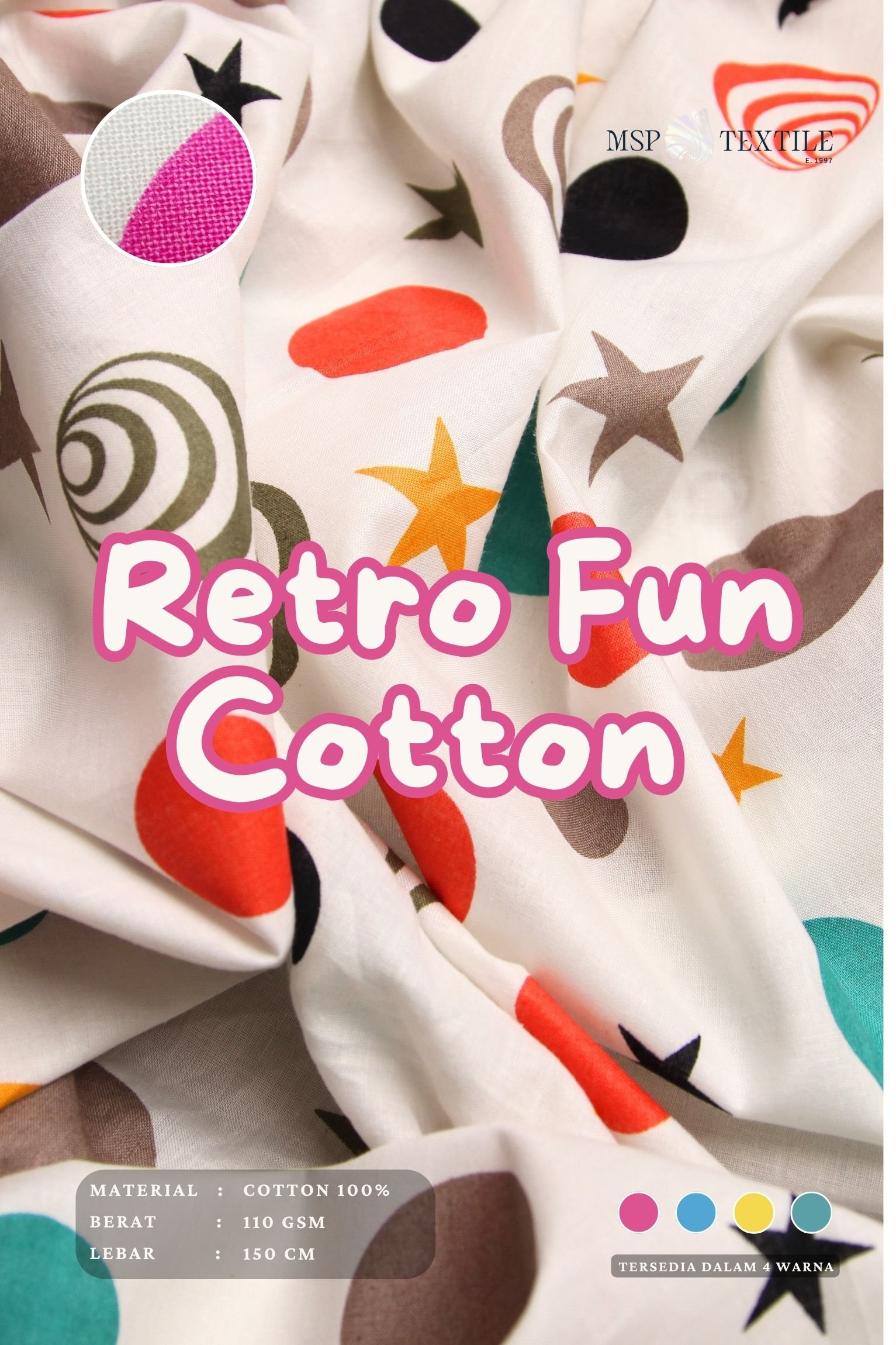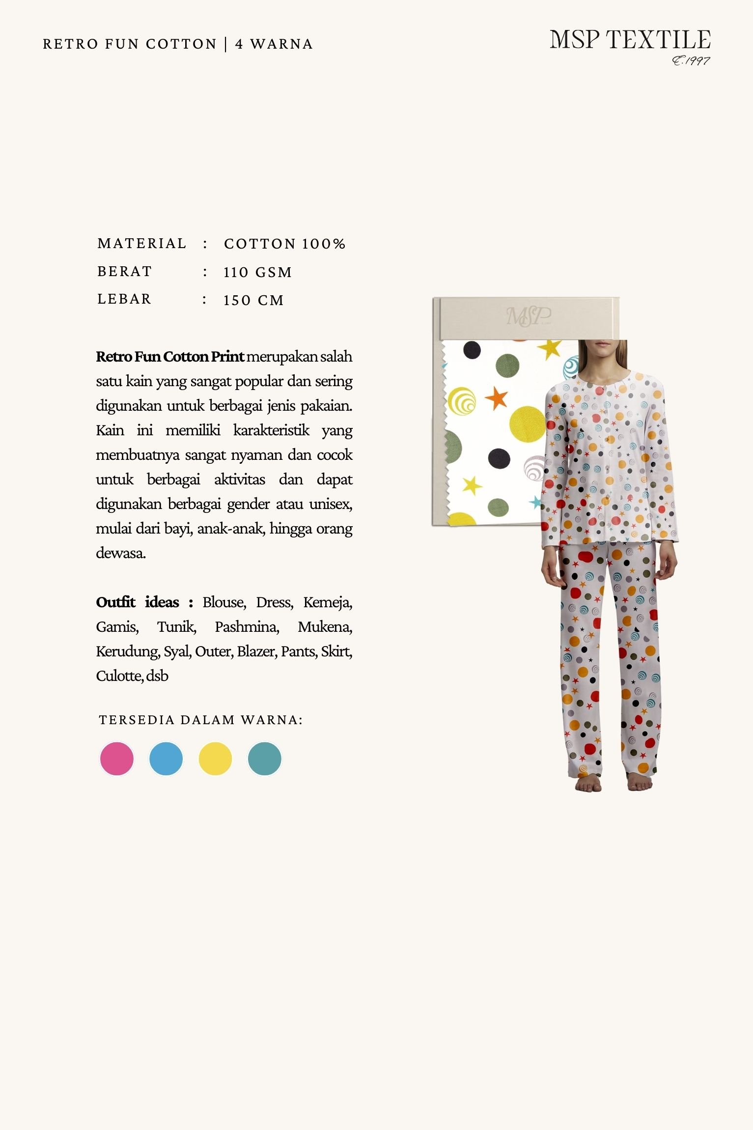 Retro Fun Cotton Print merupakan salah satu kain yang sangat popular dan sering digunakan untuk berbagai jenis pakaian. Kain ini memiliki karakteristik yang membuatnya sangat nyaman dan cocok untuk berbagai aktivitas dan dapat digunakan berbagai gender atau unisex, mulai dari bayi, anak-anak, hingga orang dewasa.