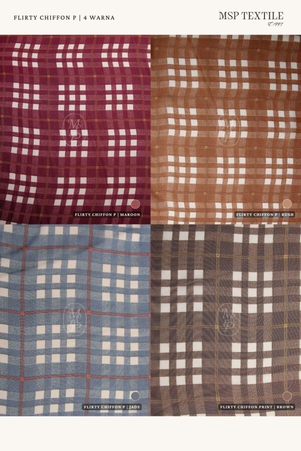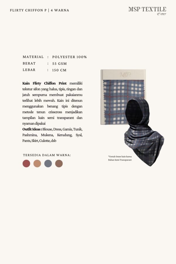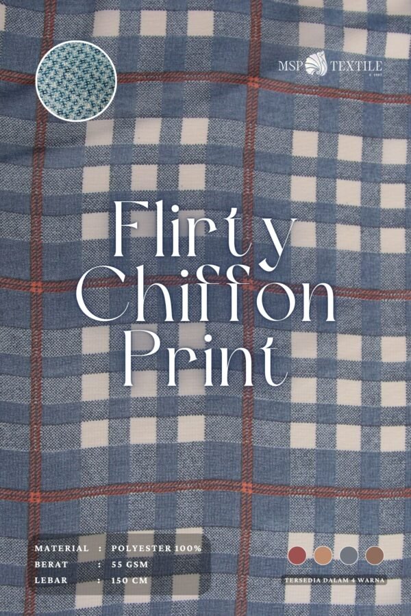 Tampilkan sisi elaganmu dengan kain Flirty Chiffon Print. Tekstur sifon yang halus, tipis, ringan dan jatuh sempurna membuat pakaianmu terlihat lebih mewah. Kain ini ditenun menggunakan benang tipis dengan metode tenun crisscross menjadikan tampilan kain semi transparant dan nyaman dipakai