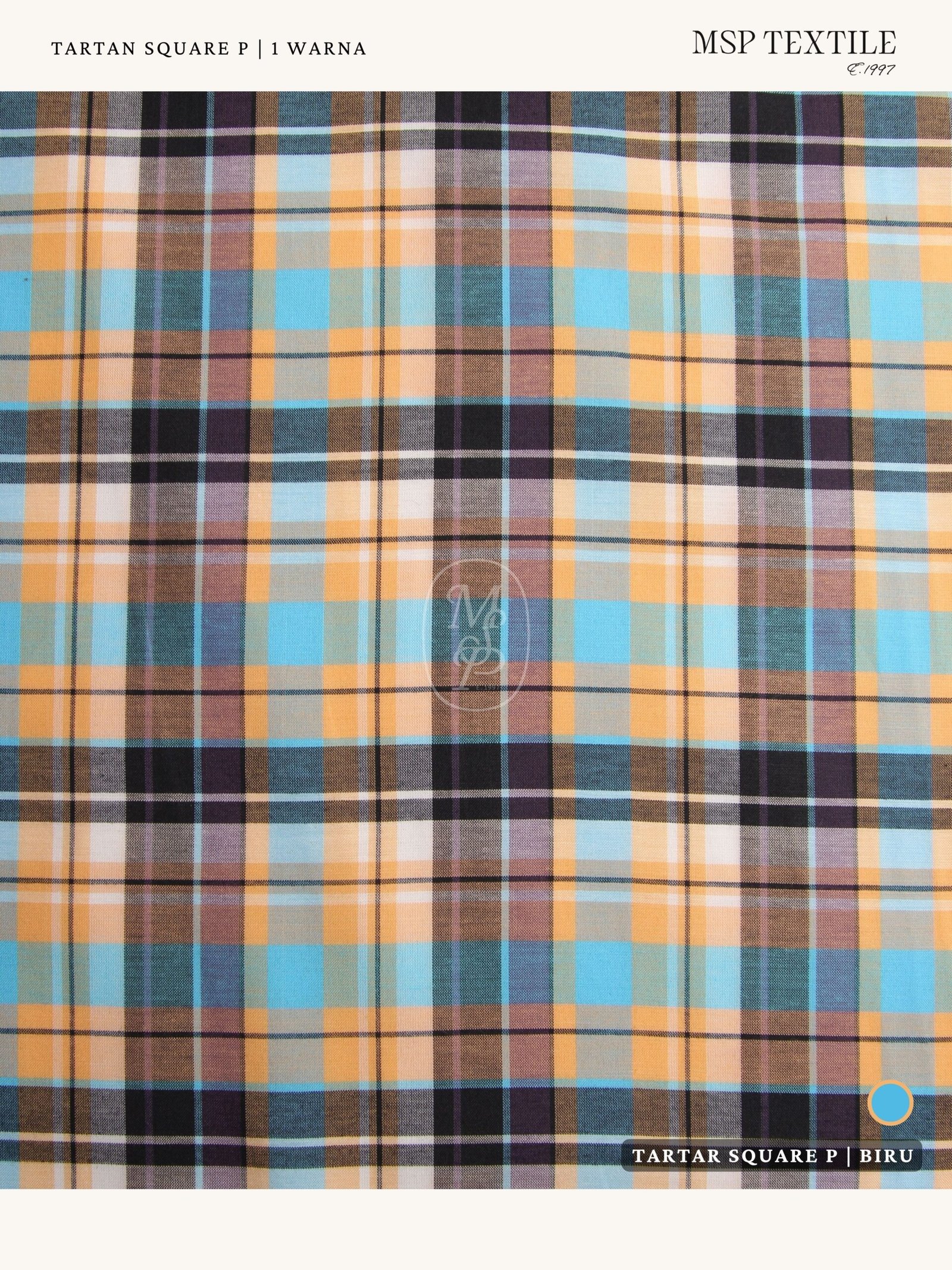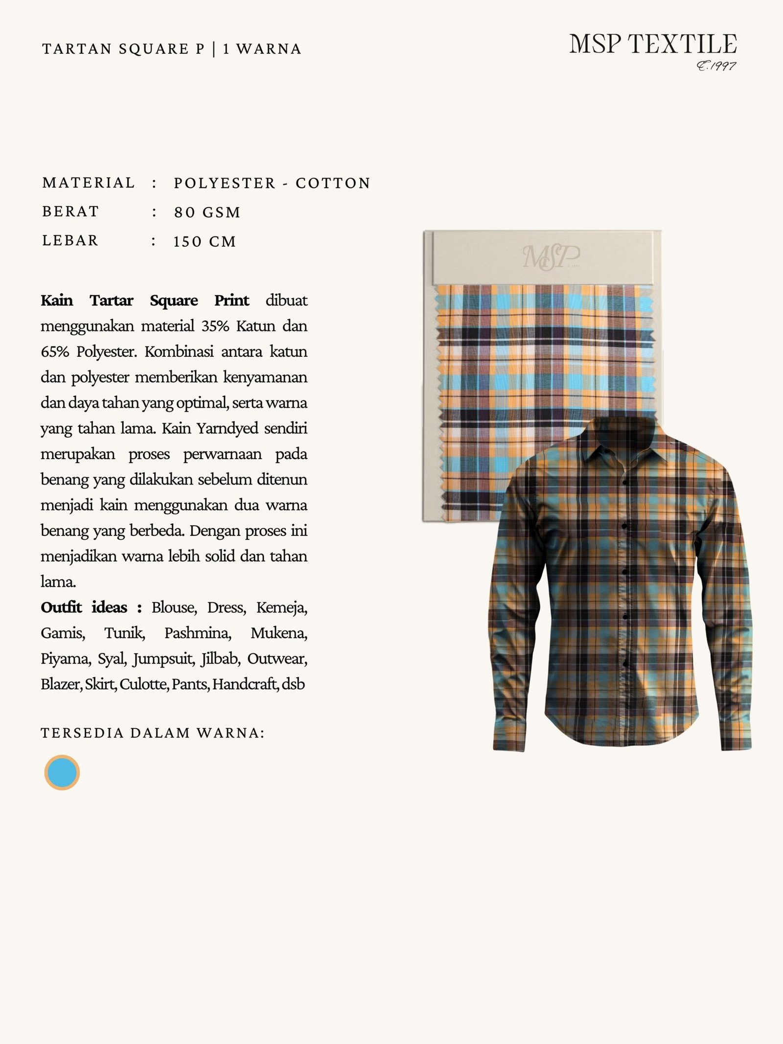 Kain Tartar Square Print #05 dibuat menggunakan material 35% Katun dan 65% Polyester. Kombinasi antara katun dan polyester memberikan kenyamanan dan daya tahan yang optimal, serta warna yang tahan lama. Kain Yarndyed sendiri merupakan proses perwarnaan pada benang yang dilakukan sebelum ditenun menjadi kain menggunakan dua warna benang yang berbeda. Dengan proses ini menjadikan warna lebih solid dan tahan lama.