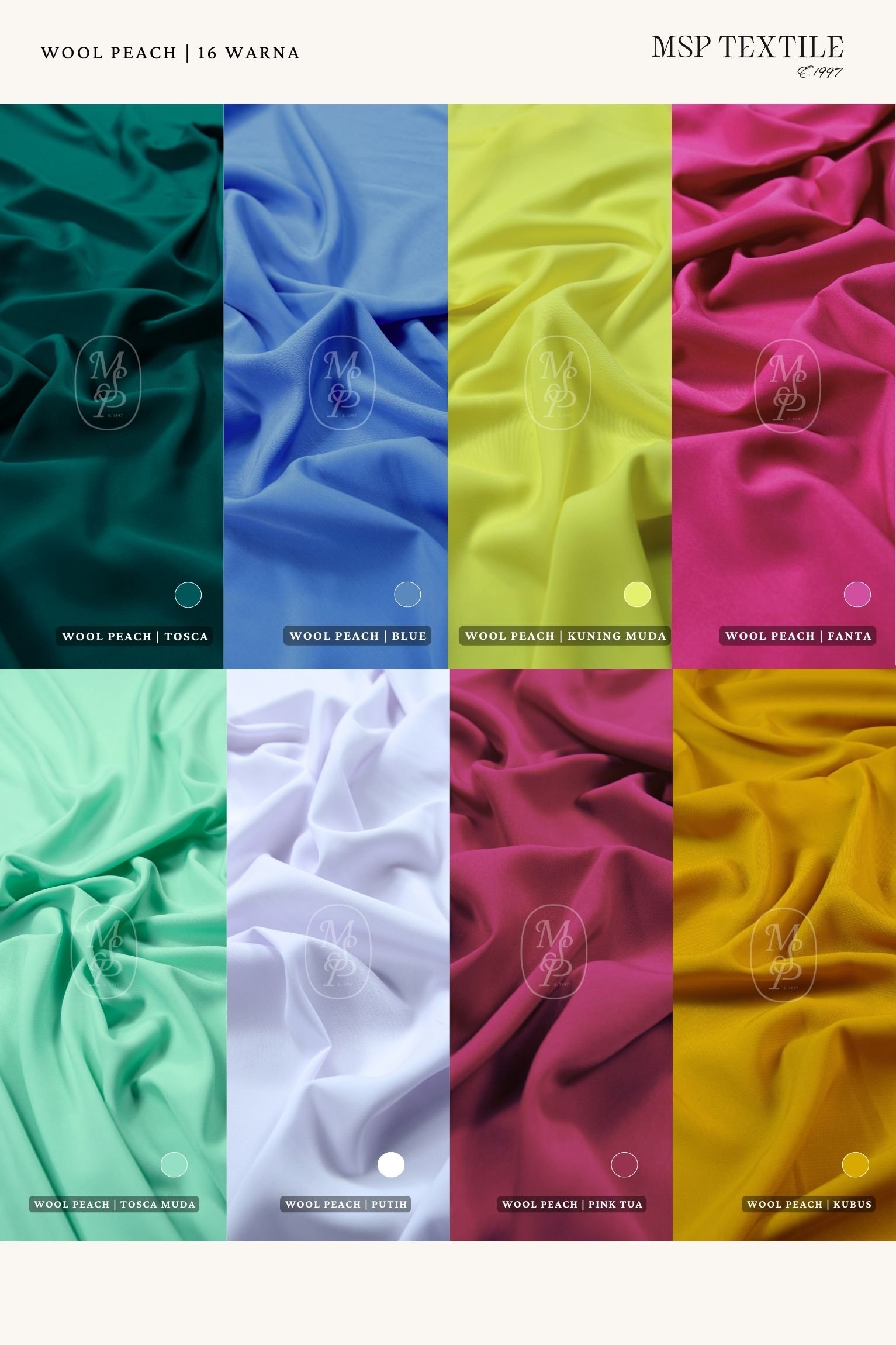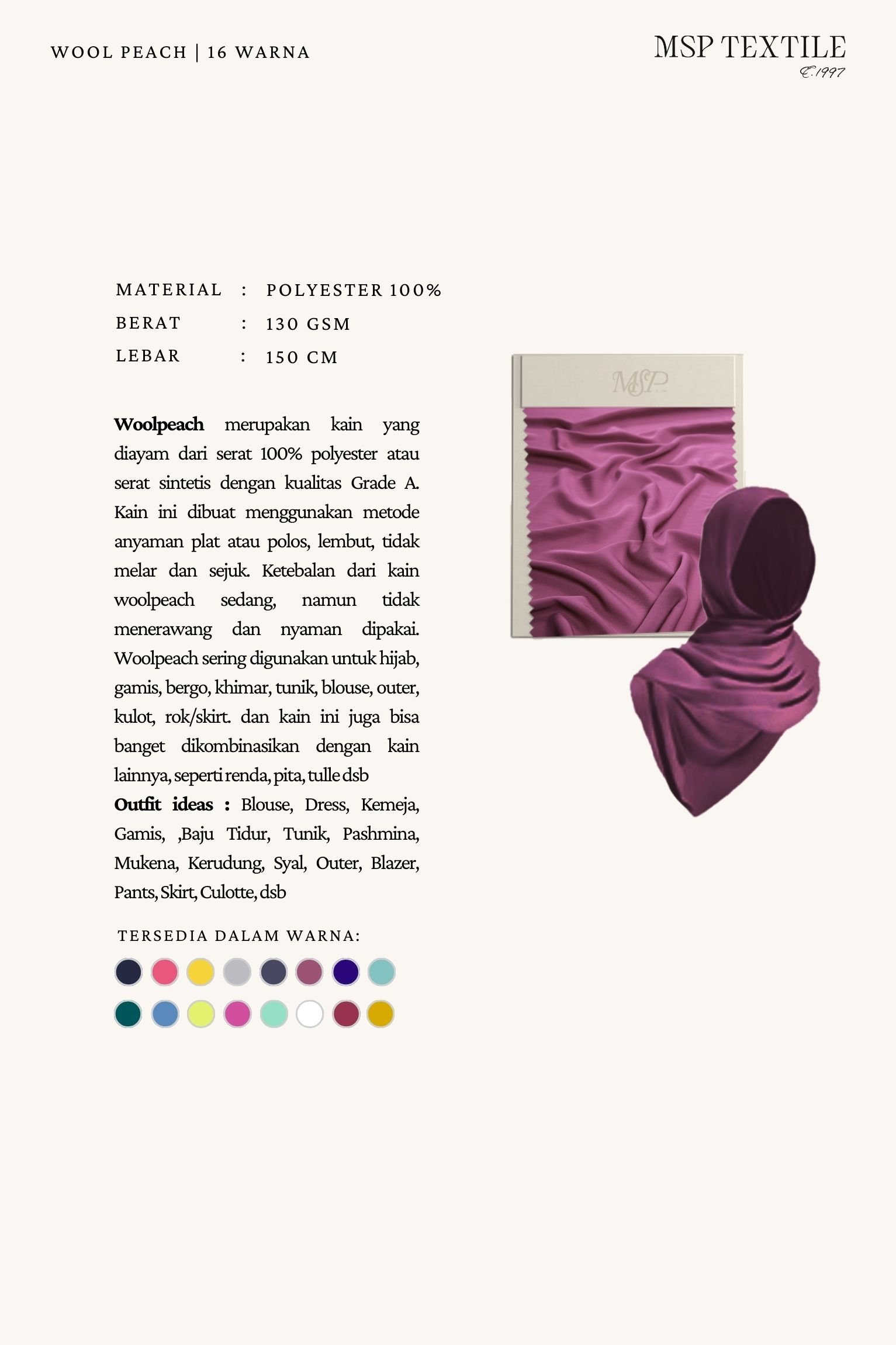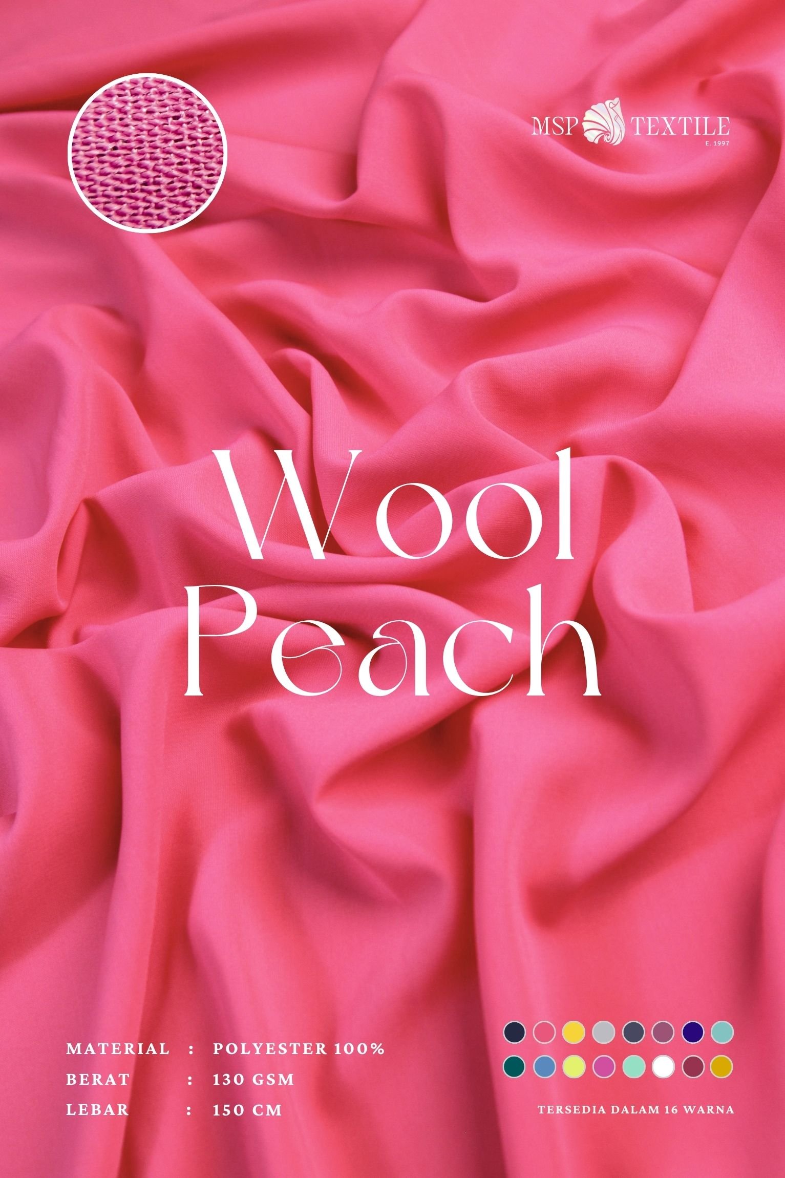 Woolpeach merupakan kain yang diayam dari serat 100% polyester atau serat sintetis dengan kualitas Grade A. Kain ini dibuat menggunakan metode anyaman plat atau polos, lembut, tidak melar dan sejuk. Ketebalan dari kain woolpeach sedang, namun tidak menerawang dan nyaman dipakai. Woolpeach sering digunakan untuk hijab, gamis, bergo, khimar, tunik, blouse, outer, kulot, rok/skirt. dan kain ini juga bisa banget dikombinasikan dengan kain lainnya, seperti renda, pita, tulle dsb
