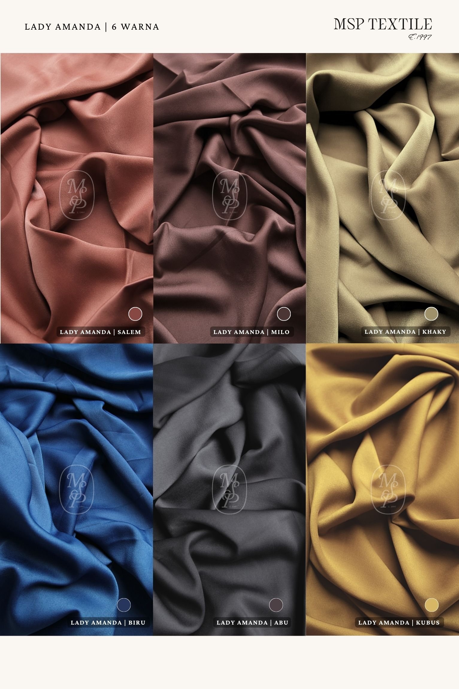 | color | 01 KUBUS, 02 SALEM, 03 BIRU, 04 MILO, 05 KHAKY, 06 ABU |