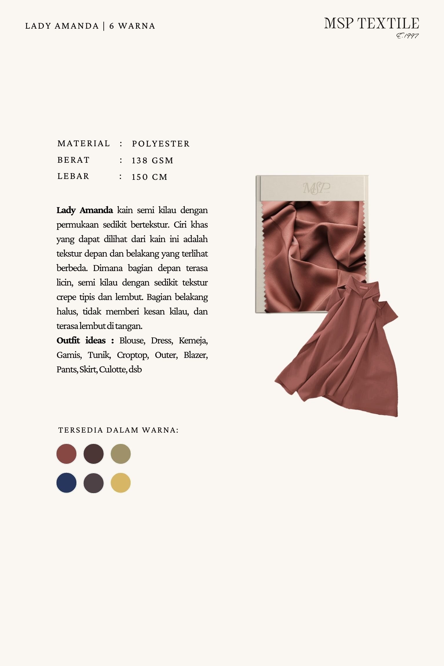 LADY AMANDA kain semi kilau dengan permukaan sedikit bertekstur. Ciri khas yang dapat dilihat dari kain ini adalah tekstur depan dan belakang yang terlihat berbeda. Dimana bagian depan terasa licin, semi kilau dengan sedikit tekstur crepe tipis dan lembut. Bagian belakang halus, tidak memberi kesan kilau, dan terasa lembut di tangan.