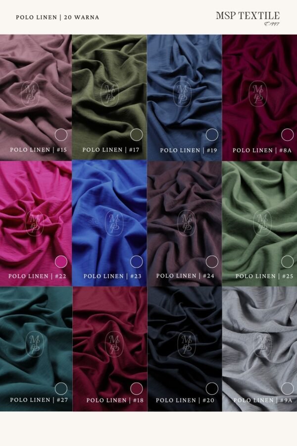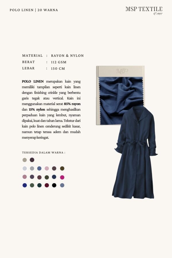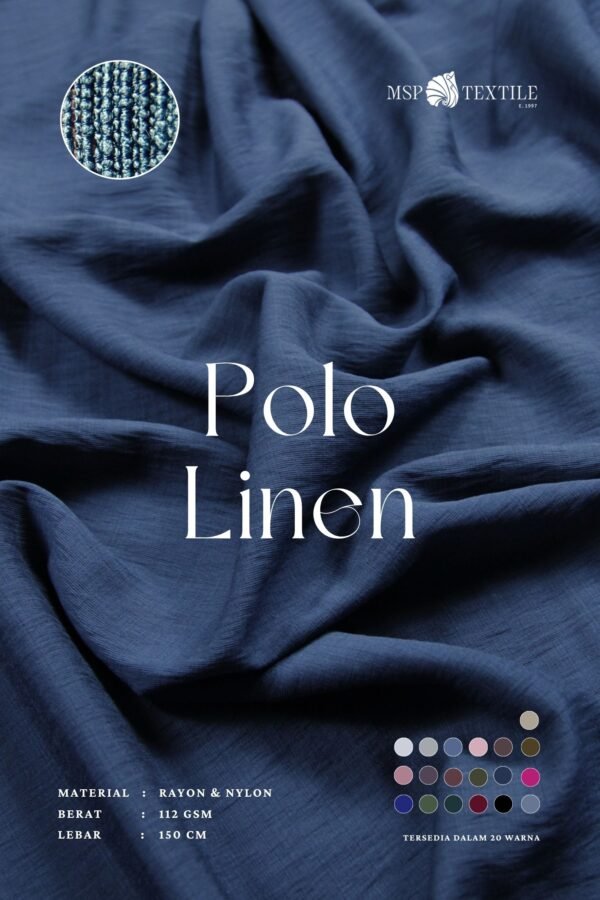POLO LINEN 27W merupakan kain yang memiliki tampilan seperti kain linen dengan finishing crinkle yang berbentu garis tegak atau vertical. Kain ini menggunakan material serat 85% rayon dan 15% nylon sehingga menghasilkan perpaduan kain yang lembut, nyaman dipakai, kuat dan tahan lama. Tekstur dari kain polo linen cenderung sedikit kasar, namun tetap terasa adem dan mudah menyerap keringat.
