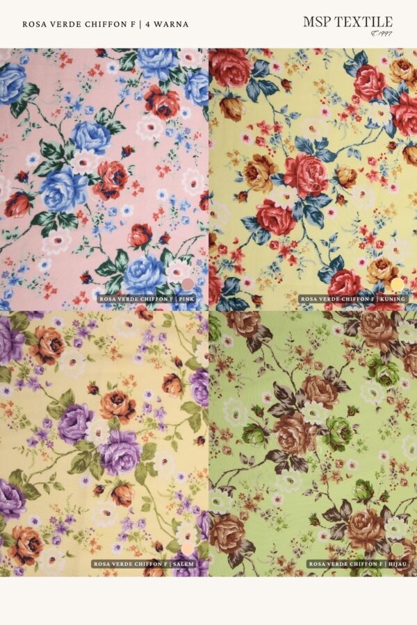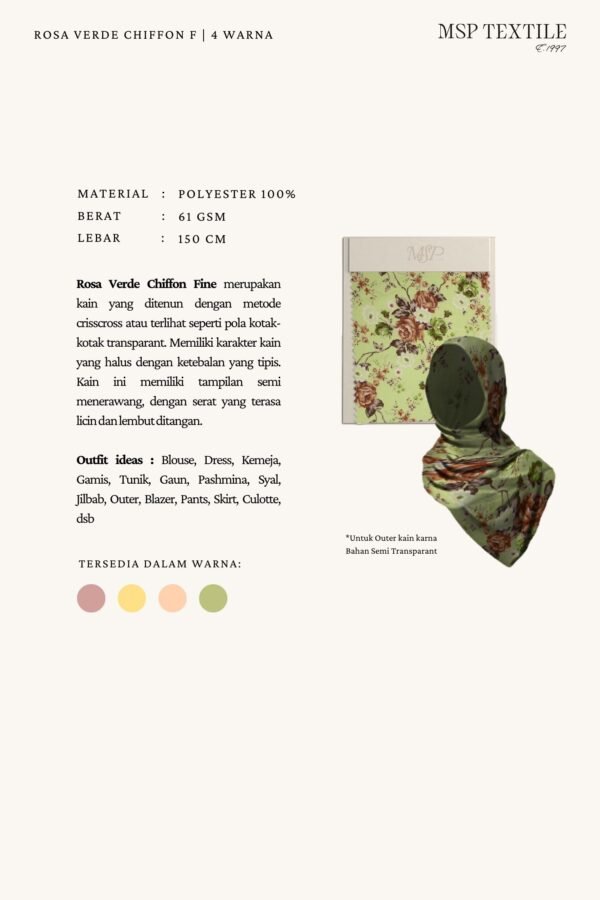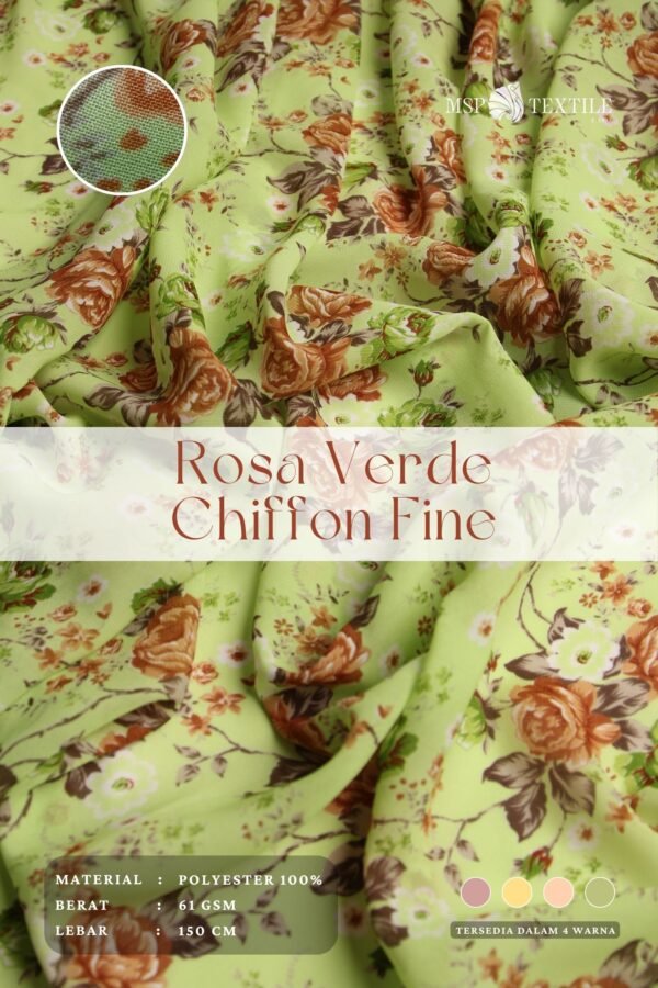 Rosa Verde Chiffon Fine merupakan kain yang ditenun dengan metode crisscross atau terlihat seperti pola kotak-kotak transparant. Memiliki karakter kain yang halus dengan ketebalan yang tipis. Kain ini memiliki tampilan semi menerawang, dengan serat yang terasa licin dan lembut ditangan.