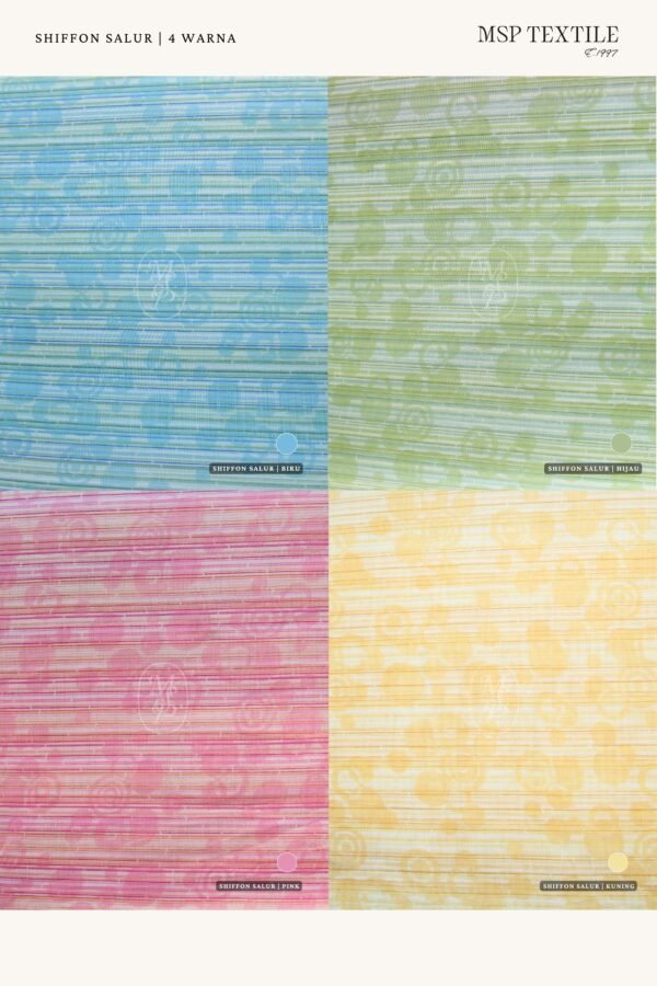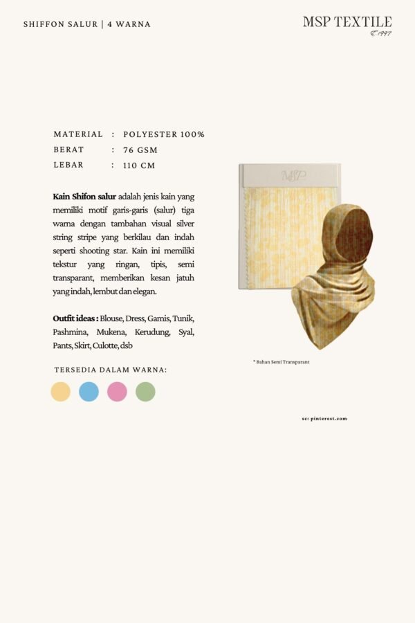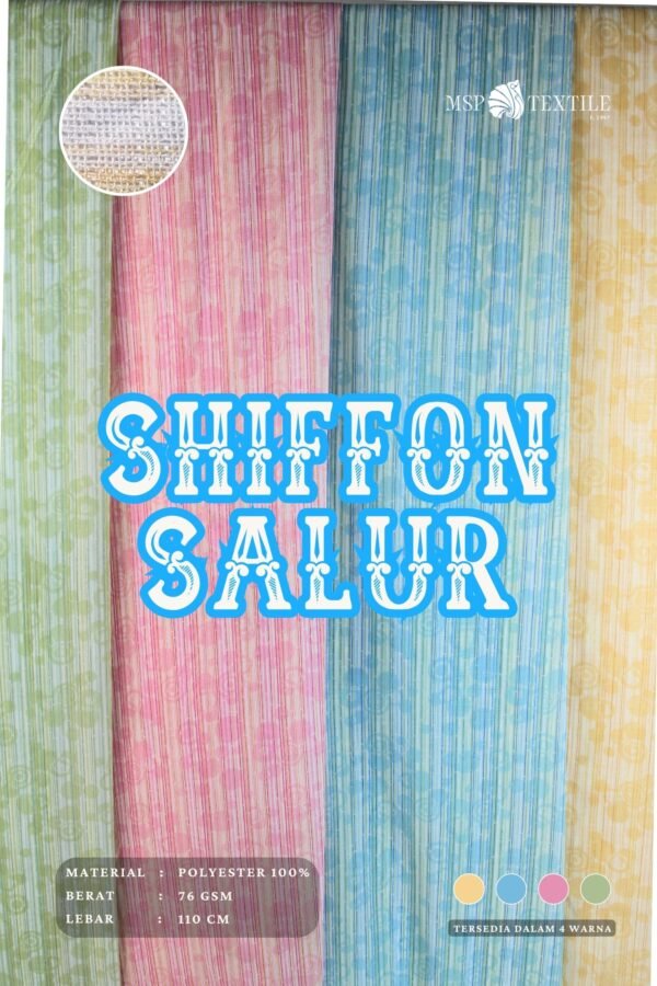 Kain Shifon salur adalah jenis kain yang memiliki motif garis-garis (salur) tiga warna dengan tambahan visual silver string stripe yang berkilau dan indah seperti shooting star. Kain ini memiliki tekstur yang ringan, tipis, semi transparant, memberikan kesan jatuh yang indah, lembut dan elegan.